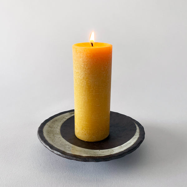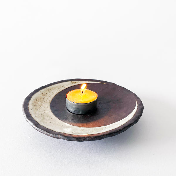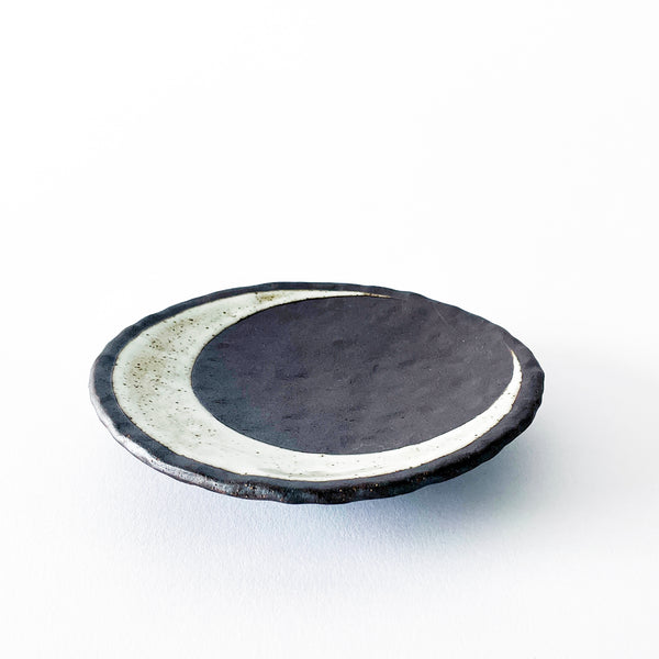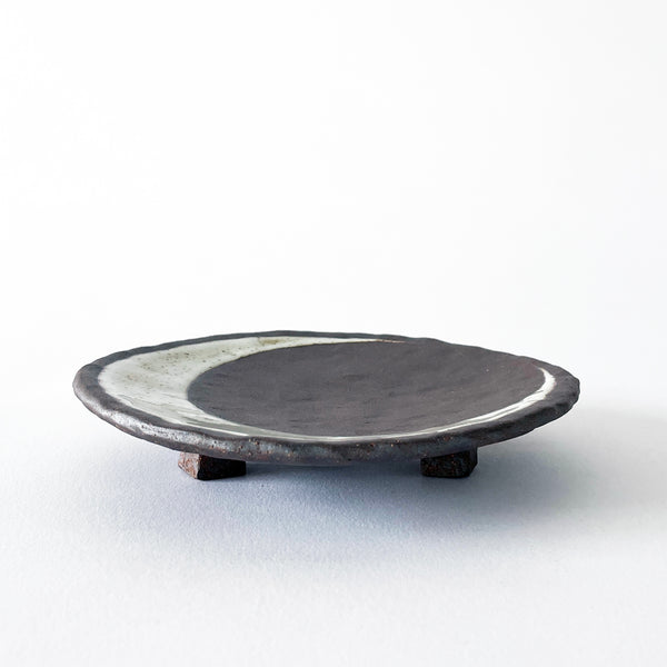 Round footed Tucker extra dark stoneware dish is hammered and hand painted with a glazed Crescent and signature marigold Sun on the back