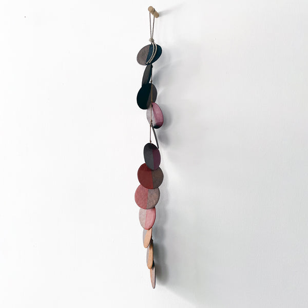 A long strand of 12 layered Tucker stoneware discs in Rainbow (Indigo, Red, Orange, Marigold)
