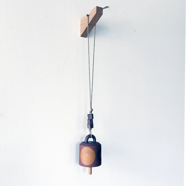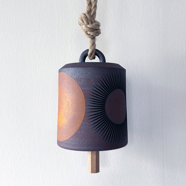 Wide wheel thrown bell in extra dark Tucker stoneware is hand painted with Sun & Yellow, side by side and a signature glazed crescent