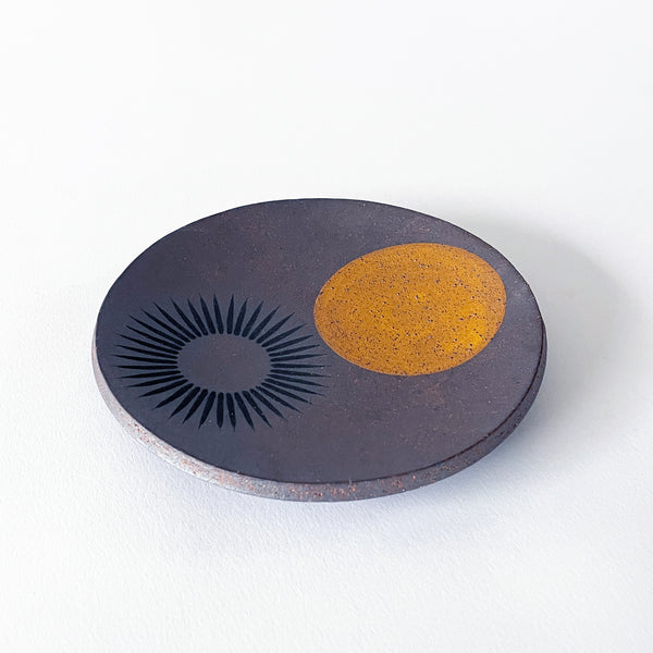 Round Tucker stoneware dish is hand painted with a Sun & Yellow