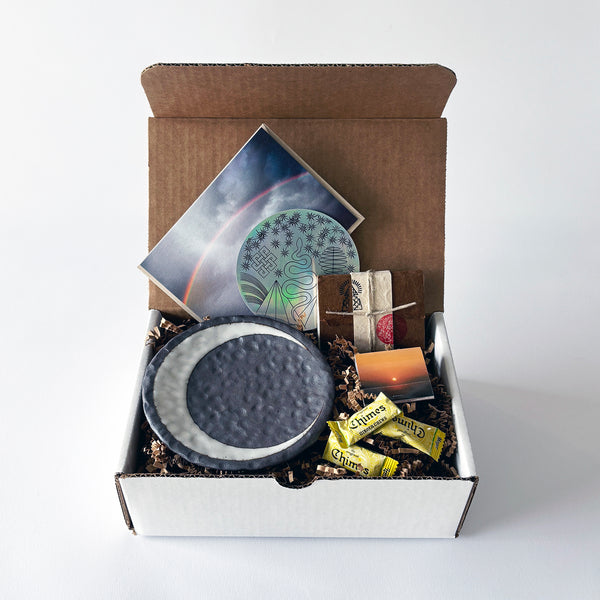 Gift-wrapped box includes: Dish, soap, sticker, matchbook, ginger chews & rainbow notecard with kraft envelope