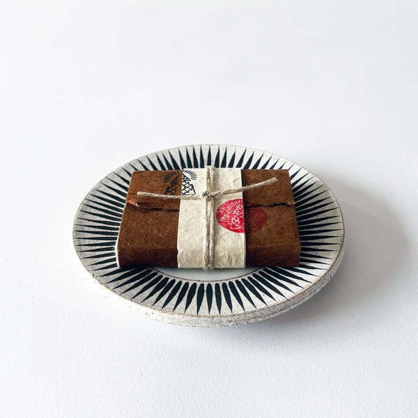 Stoneware dish painted with a New Sun in white & Incausa Soap bar wrapped with Traditional Nepalese Lokta paper