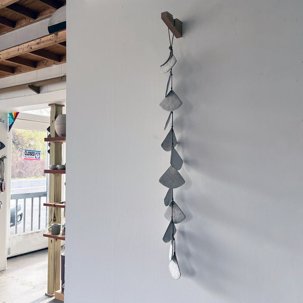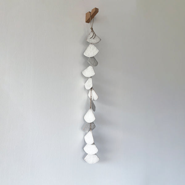 A long single strand of 12 white stoneware shells & walnut wall mount