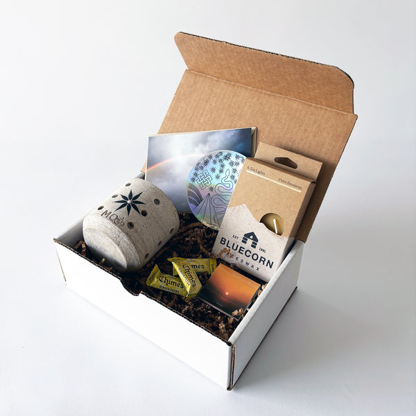 Gift-wrapped box includes: Vessel, 6 tealights, sticker, matchbook, ginger chews & rainbow notecard with kraft envelope