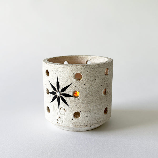 Wheel thrown stoneware vessel has a cut out grid pattern that lights up with a tealight candle and is painted with a signature star