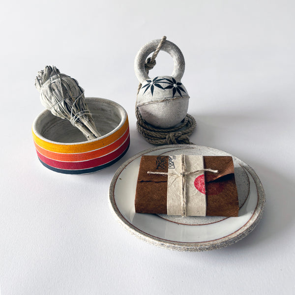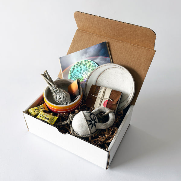 Gift-wrapped box includes: Votive, jingle bell, dish, sage bundle, soap, sticker, matchbook, ginger chews & rainbow notecard with kraft envelope