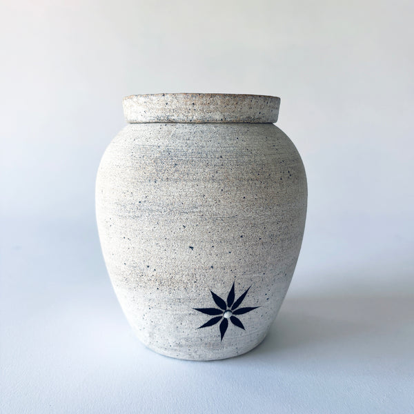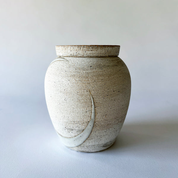 Stoneware Memoriam teardrop vessel hand painted with a glazed Crescent Moon in white and a signature star