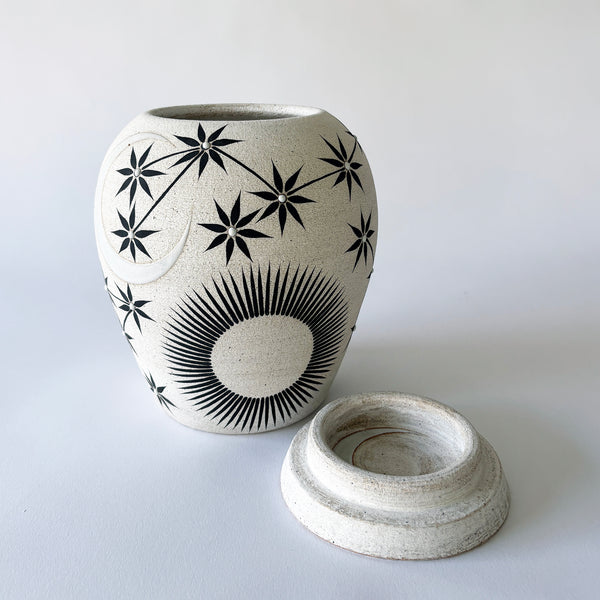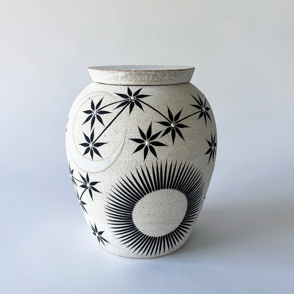 Stoneware Memoriam teardrop vessel hand painted with 'Sun Moon Stars'