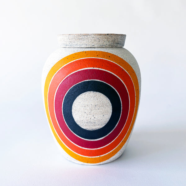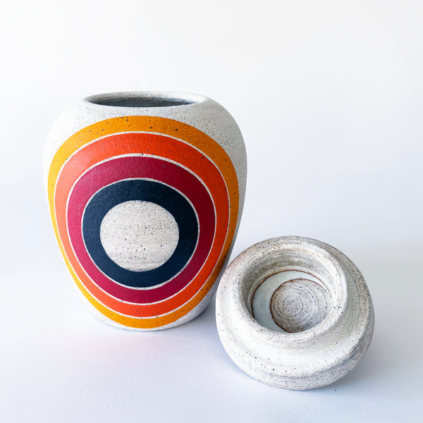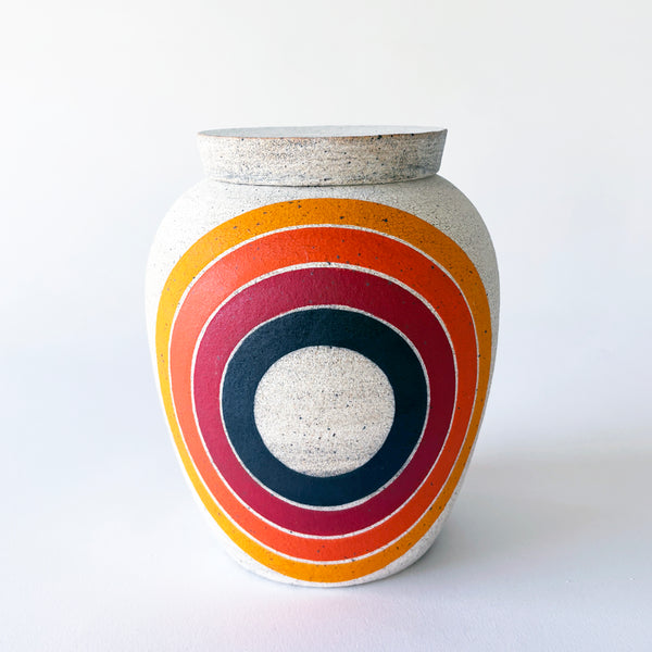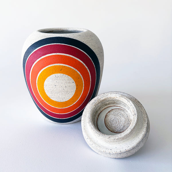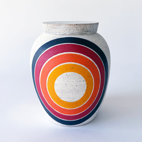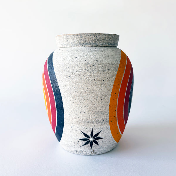 Stoneware Memoriam teardrop vessel hand painted with rainbow rings on both sides, a signature star & glazed crescent inside of lid