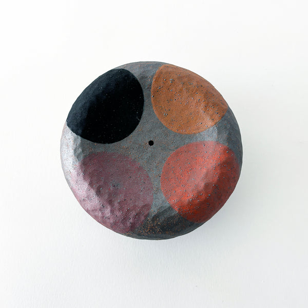 Hand built incense burner in Tucker extra dark stoneware is hammered and painted with 'Four' in rainbow (Indigo, Red, Orange, Marigold) & a glazed signature Crescent