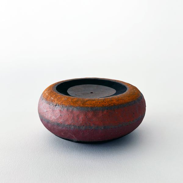 Hand built incense burner in Tucker extra dark stoneware is hammered and painted with Rings in rainbow (Indigo, Red, Orange, Marigold) & a glazed signature Crescent