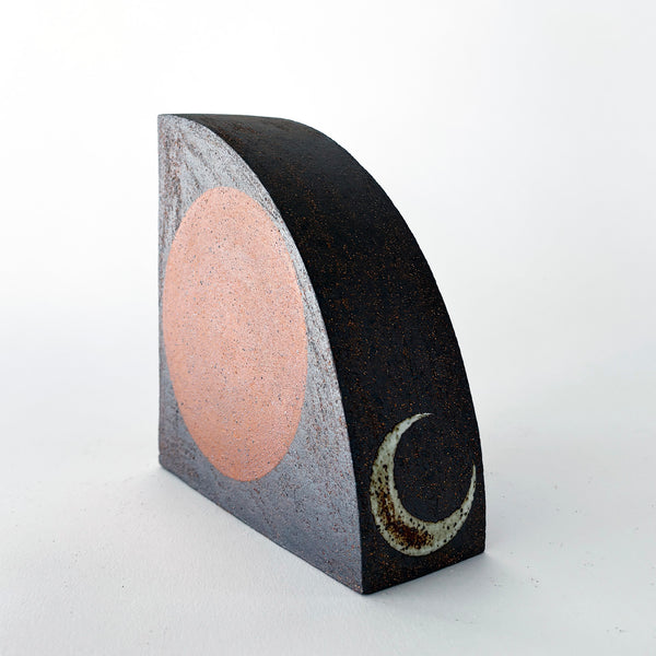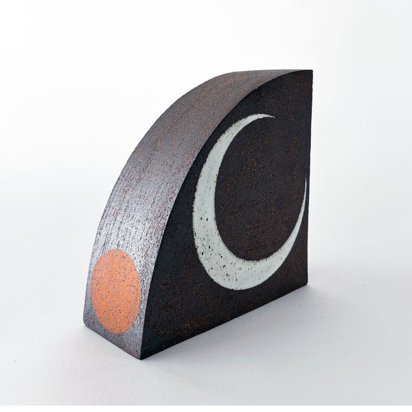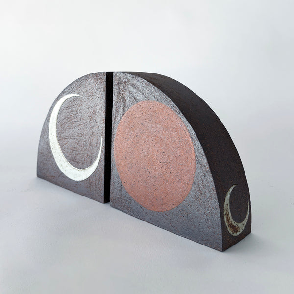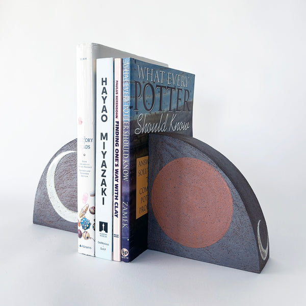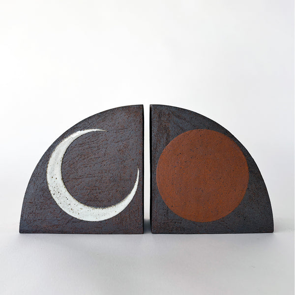 Handbuilt Bookends in extra dark Tucker Stoneware are hand painted with a glazed crescent & full moon in Marigold