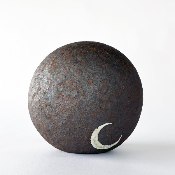 Hand built standing Rock object in Tucker extra dark is hand painted with 'Nested' in Four Black (Black, Dark Brown, Med Brown, Golden Brown) and a signature glazed Crescent