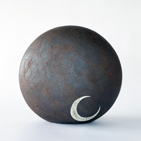 Hand built standing Rock object in Tucker extra dark is hand painted with 'Nested' in Rainbow (Indigo, Red, Orange, Marigold) and a signature glazed Crescent