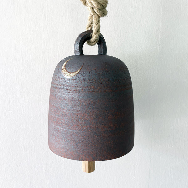 Round wheel thrown bell in extra dark Tucker stoneware is hand painted with Nested Circles in Rainbow with a glazed crescent signature