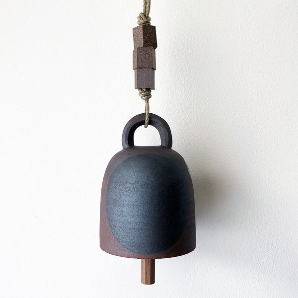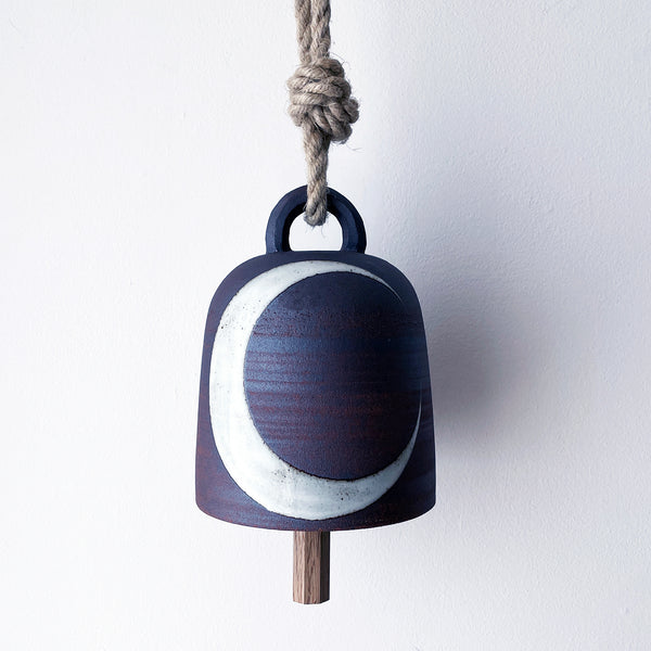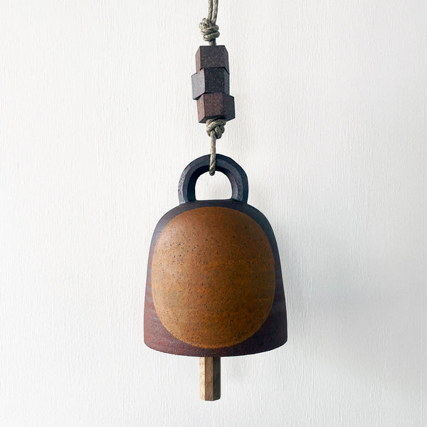 Round wheel thrown bell in extra dark Tucker stoneware is hand painted with Sun on one side