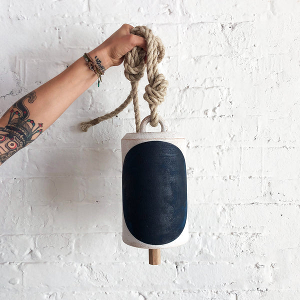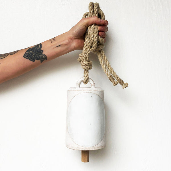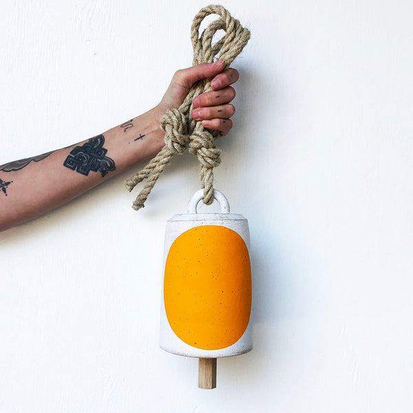 Round wheel thrown stoneware bell is hand painted with the Sun and available alone or with a Glazed Crescent, Full Moon White, Full Moon Marigold, or Full Moon Indigo on the other side