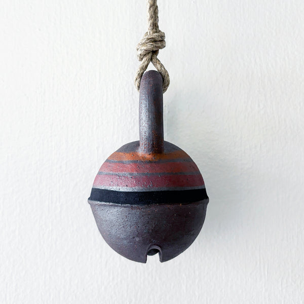 Round XS Tucker stoneware jingle bell is hand painted with Rainbow Rings