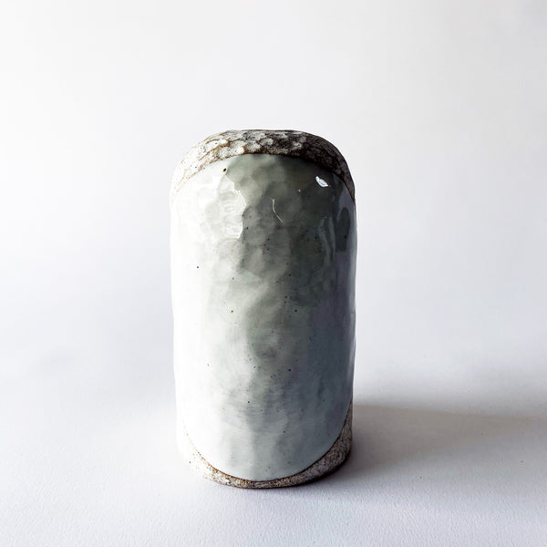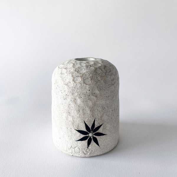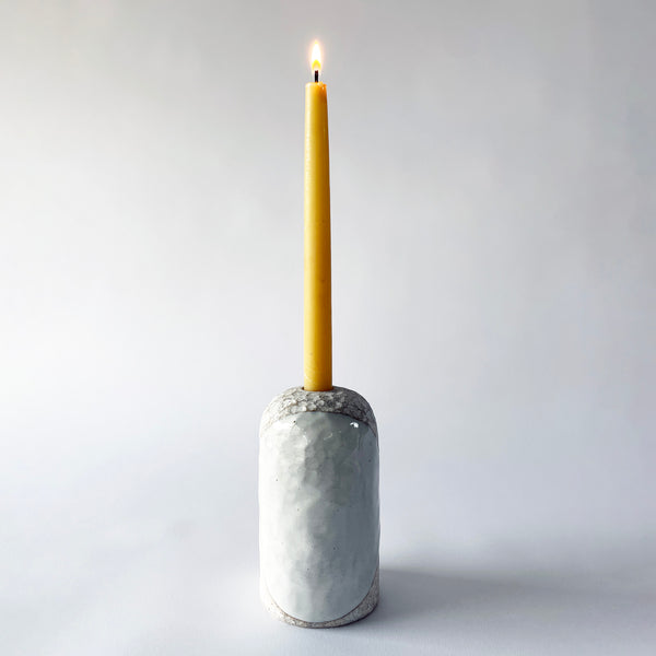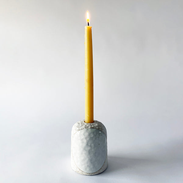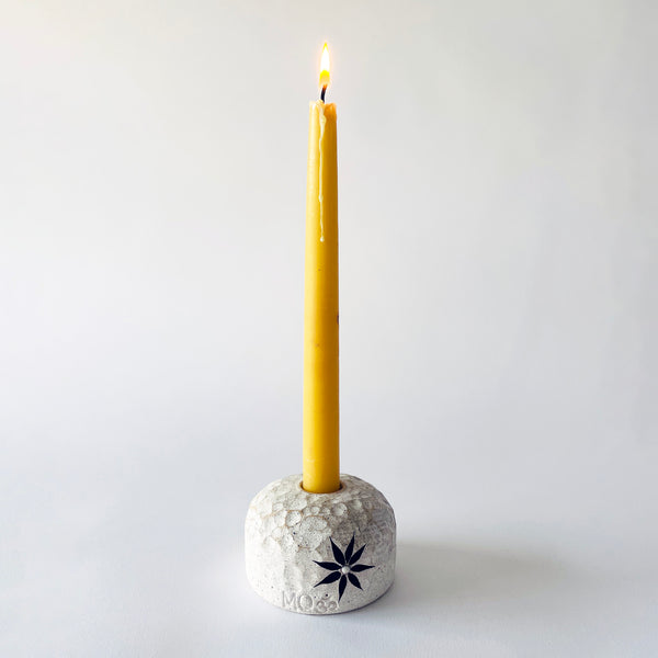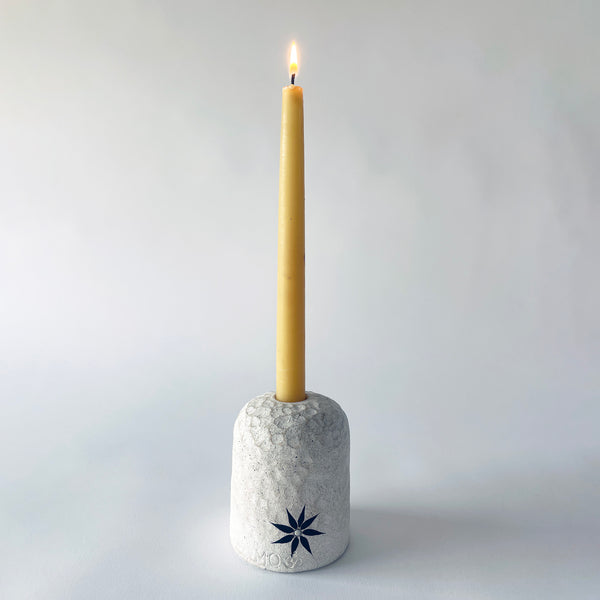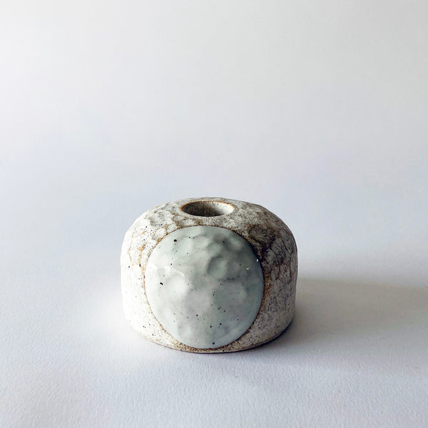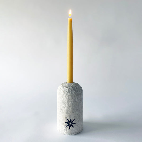 Taper candle holder is wheel thrown stoneware, hammered and hand painted with a Full Moon in White & Star signature