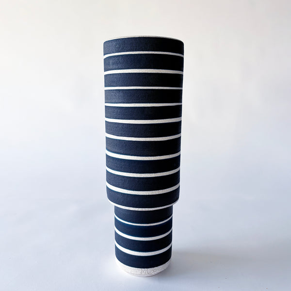 Thin stepped wheel thrown stoneware vessel is hand painted with Indigo Rings