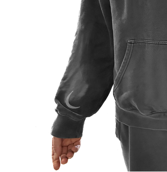 Printed locally in the Hudson Valley, a mid weight faded black 9.4 oz, 80% cotton 20% recycled polyester CVC fleece, has been pre-shrunk, features a self-fabric lined pullover hood, drop shoulder, kangaroo pocket, and no drawcord for a seamless look